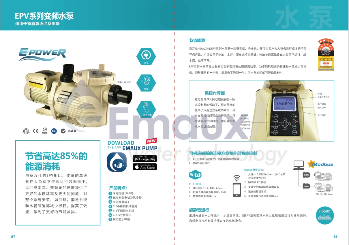 與意萬仕的EPV相比,傳統的單速泵在大負荷下連續運行效率低下,運行成本高。變頻泵的速度提供了更好的水循環率及更少的排放,對整個系統安裝,如沙缸,消毒系統 和水管裝置都減少損耗,提高了效能,做到了更好的節能減排。