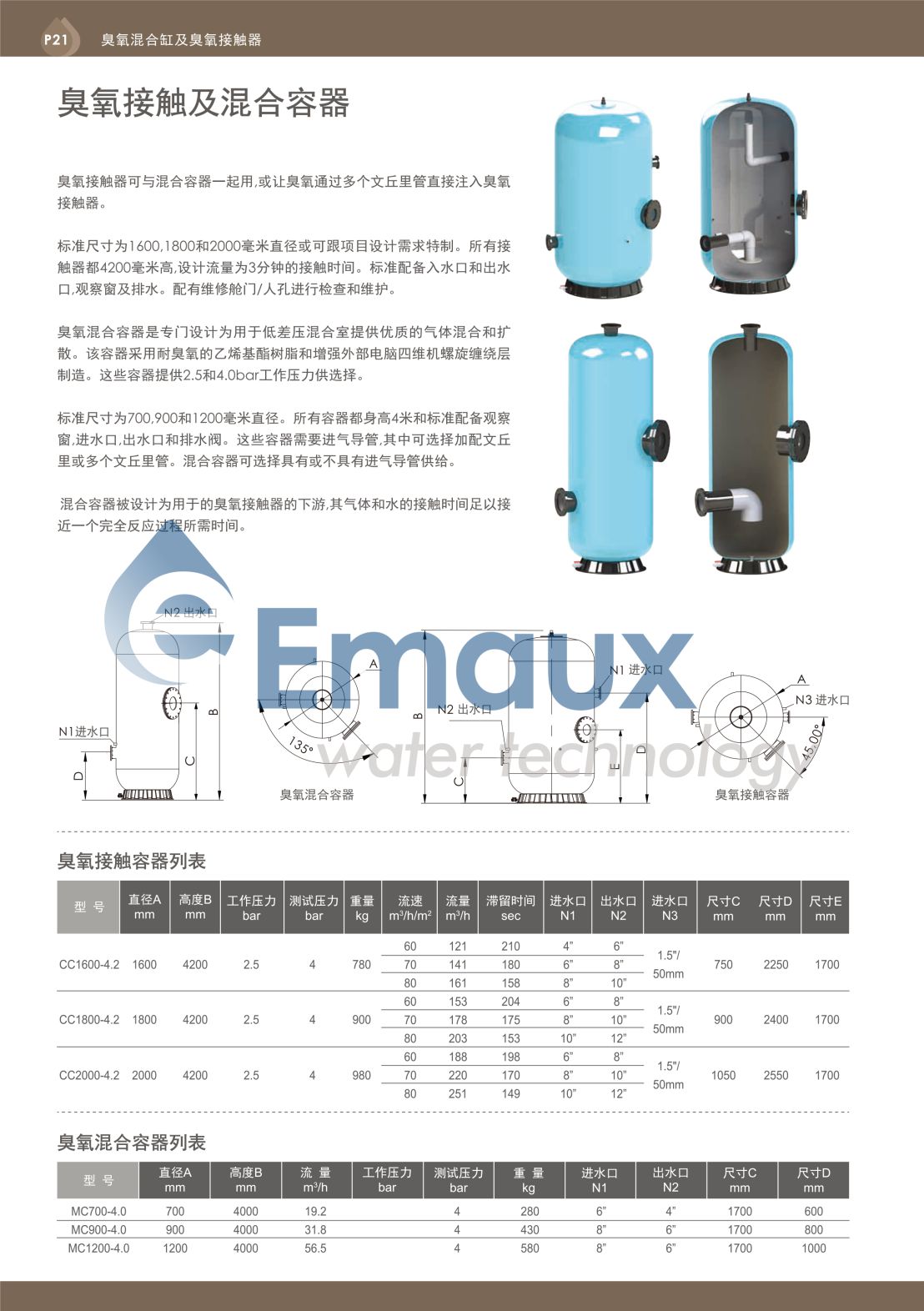 臭氧接觸器可與混合容器一起用,或讓臭氧通過多個(gè)文丘里管直接注入臭氧接觸器。 標(biāo)準(zhǔn)尺寸為1600,1800和2000毫米直徑或可跟項(xiàng)目設(shè)計(jì)需求特制。所有接觸器都4200毫米高,設(shè)計(jì)流量為3分鐘的接觸時(shí)間。標(biāo)準(zhǔn)配備入水口和出水口觀察窗及排水。配有維修艙門/人孔進(jìn)行檢查和維護(hù)。