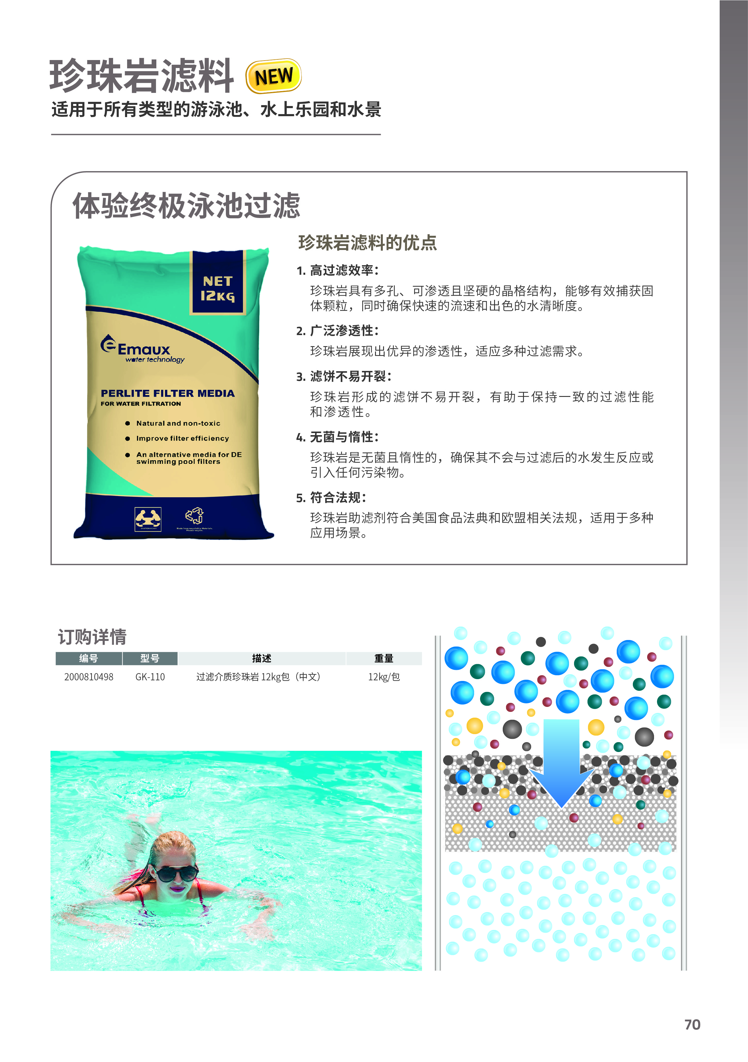珍珠巖濾料的優(yōu)點(diǎn): 1.?過(guò)濾效率: 珍珠巖具有多孔、可滲透且堅(jiān)硬的晶格結(jié)構(gòu),能夠有效捕獲固 體顆粒,同時(shí)確保快速的流速和出色的水清晰度。 2.廣泛滲透性: 珍珠巖展現(xiàn)出優(yōu)異的滲透性,適應(yīng)多種過(guò)濾需求。 3.濾餅不易開(kāi)裂: 珍珠巖形成的濾餅不易開(kāi)裂,有助于保持一致的過(guò)濾性能 和滲透性。 4.無(wú)菌與惰性: 珍珠巖是無(wú)菌且惰性的,確保其不會(huì)與過(guò)濾后的水發(fā)生反應(yīng)或 引入任何污染物。 5.符合法規(guī): 珍珠巖助濾劑符合美國(guó)食品法典和歐盟相關(guān)法規(guī),適用于多種 應(yīng)用場(chǎng)景。