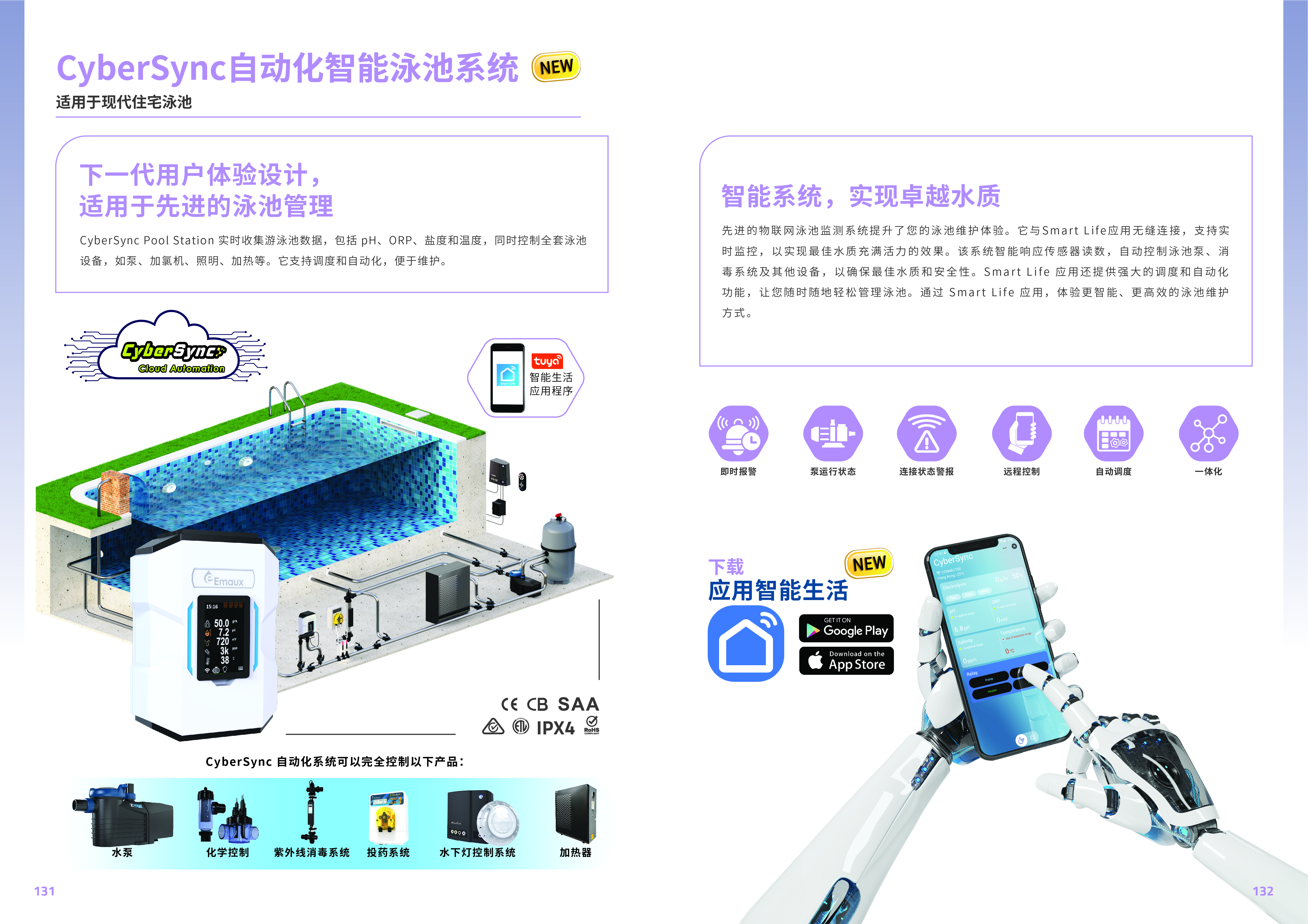 CyberSync Pool Station 實時收集游泳池數據,包括 pH、ORP、鹽度和溫度,同時控制全套泳池 設備,如泵、加氯機、照明、加熱等。它支持調度和自動化,便于維護。