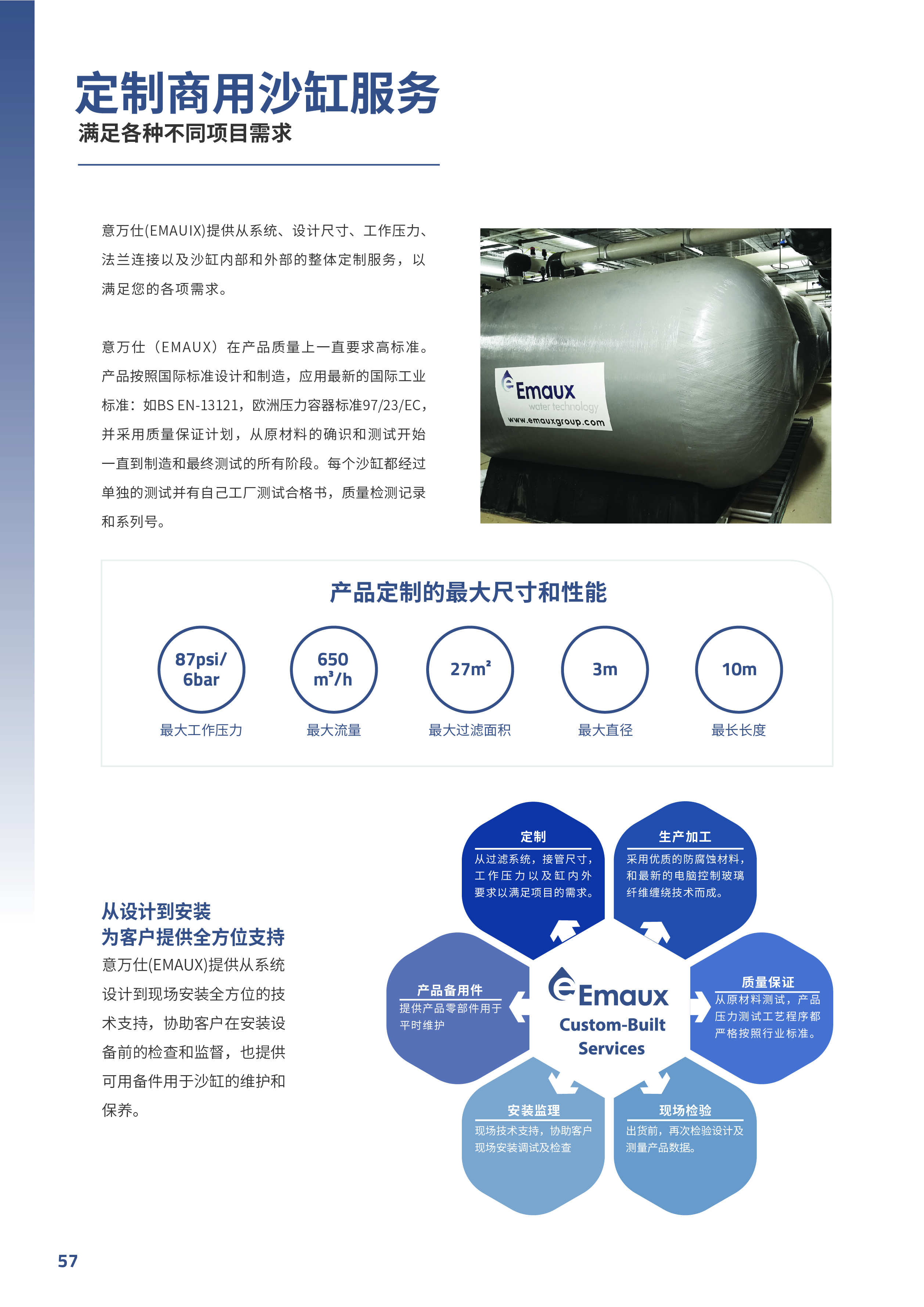 意萬仕(EMAUX)提供從系統 設計到現場安裝全方位的技 術支持,協助客戶在安裝設 備前的檢查和監督,也提供 可用備件用于沙缸的維護和 保養。