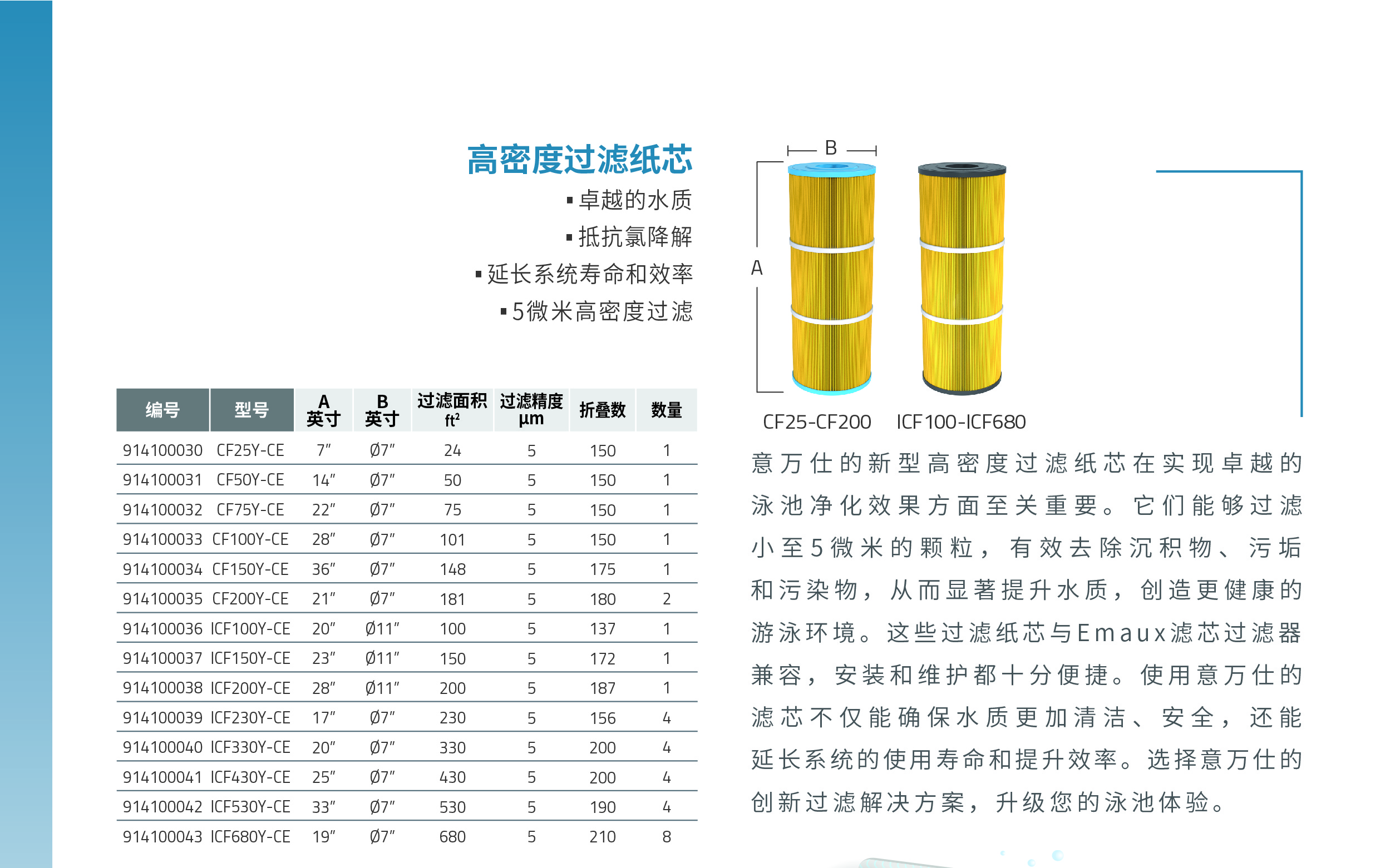意萬仕的新型高密度過濾紙芯在實現卓越的 泳池凈化效果方面至關重要。它們能夠過濾 小至5微米的顆粒,有效去除沉積物、污垢 和污染物,從而顯著提升水質,創造更健康的 游泳環境。這些過濾紙芯與Emaux濾芯過濾器 兼容,安裝和維護都十分便捷。使用意萬仕的 濾芯不僅能確保水質更加清潔、安全,還能 延長系統的使用壽命和提升效率。選擇意萬仕的 創新過濾解決方案,升級您的泳池體驗。