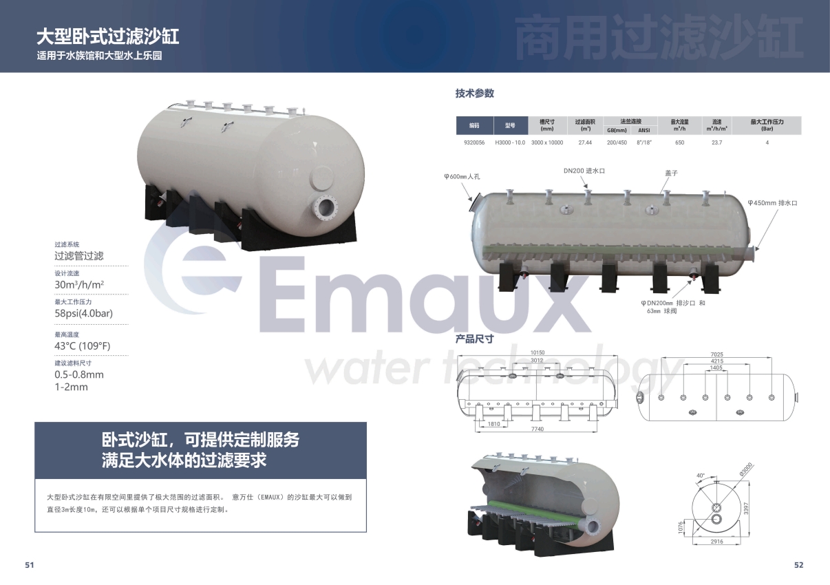 競技池大型臥式沙缸在有限空間里提供了極大范圍的過濾面積。 意萬仕(EMAUX)的沙缸最大可以做到直徑3m長度10m。還可以根據(jù)單個(gè)項(xiàng)目尺寸規(guī)格進(jìn)行定制。