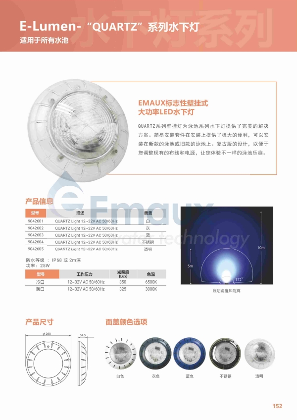 競技池QUARTZ系列壁掛燈為泳池系列水下燈提供了完美的解決方案。簡易安裝套件在安裝上提供了極大的便利,可以安裝在新的泳池或原有的泳池上。復(fù)古版的設(shè)計(jì),以便于您調(diào)整現(xiàn)有的布線和電源,讓您體驗(yàn)不一樣的泳池樂趣。