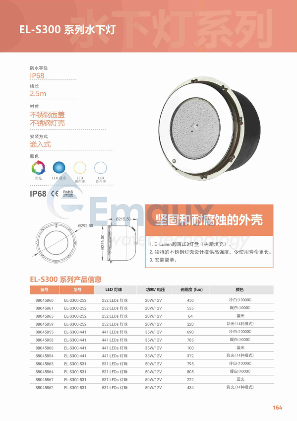 1.E-Lumen超薄LED燈盤(樹脂填充) 2.獨特的不銹鋼燈殼設計提供高強度,令使用壽命更長 3.安裝簡單