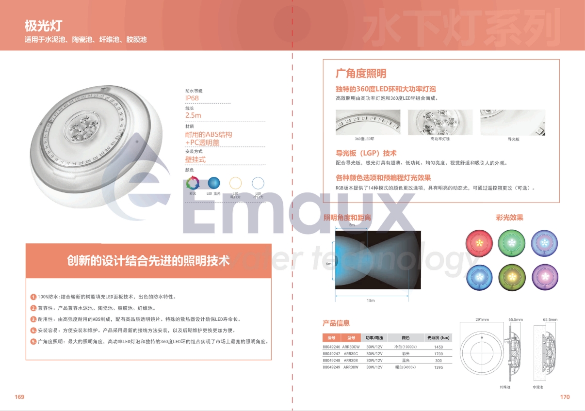 競(jìng)技池1. 100%防水:結(jié)合嶄新的樹脂填充LED面板技術(shù),出色的防水特性。 2. 兼容性:產(chǎn)品兼容水泥池、陶瓷池、膠膜池、纖維池 3. 耐用性:由高強(qiáng)度耐用的ABS制成,配有高品質(zhì)透明鏡片。特殊的散熱器設(shè)計(jì)確保LED壽命長(zhǎng) 4. 安裝容易:方便安裝和維護(hù)。產(chǎn)品采用最新的接線方法安裝以及后期維護(hù)更換更加方便 5. 廣角度照明:最大的照明角度高功率LED燈泡和獨(dú)特的360度LED環(huán)的組合實(shí)現(xiàn)了市場(chǎng)上最寬的照明角度