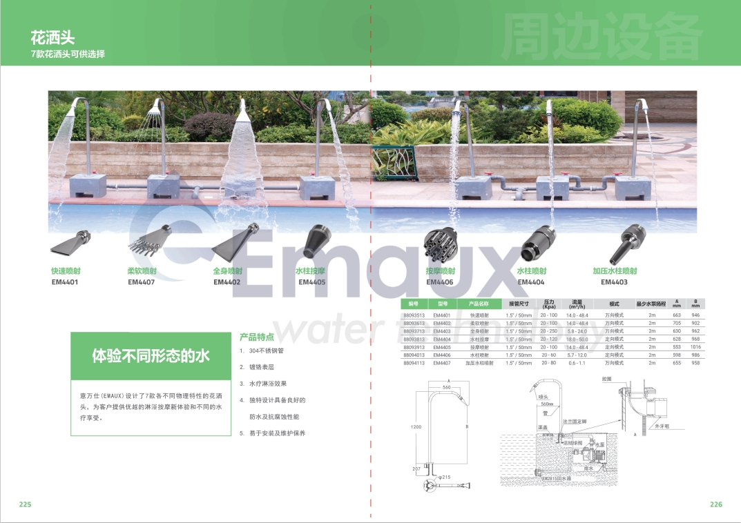 意萬仕(EMAUX)設計了7款各不同物理特性的花灑頭,為客戶提供優越的淋浴按摩新體驗和不同的水療享受。