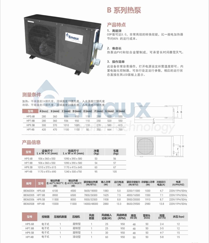 COP值可達5.0,非常高效的轉換效能,比一般電加熱器節約80% 的運行成本。