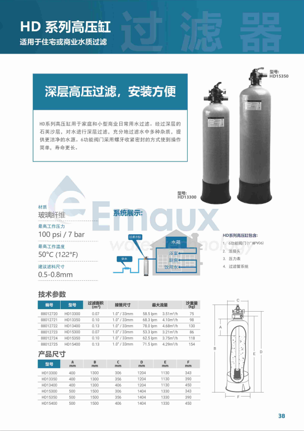 HD系列高壓缸用于家庭和小型商業日常用水過濾。經過深層的石英砂層,對水進行深層過濾,充分地過濾水中多種雜質,提供更潔凈的水源。6功能閥門采用螺牙收緊密封的方式使到操作簡單,壽命更長。