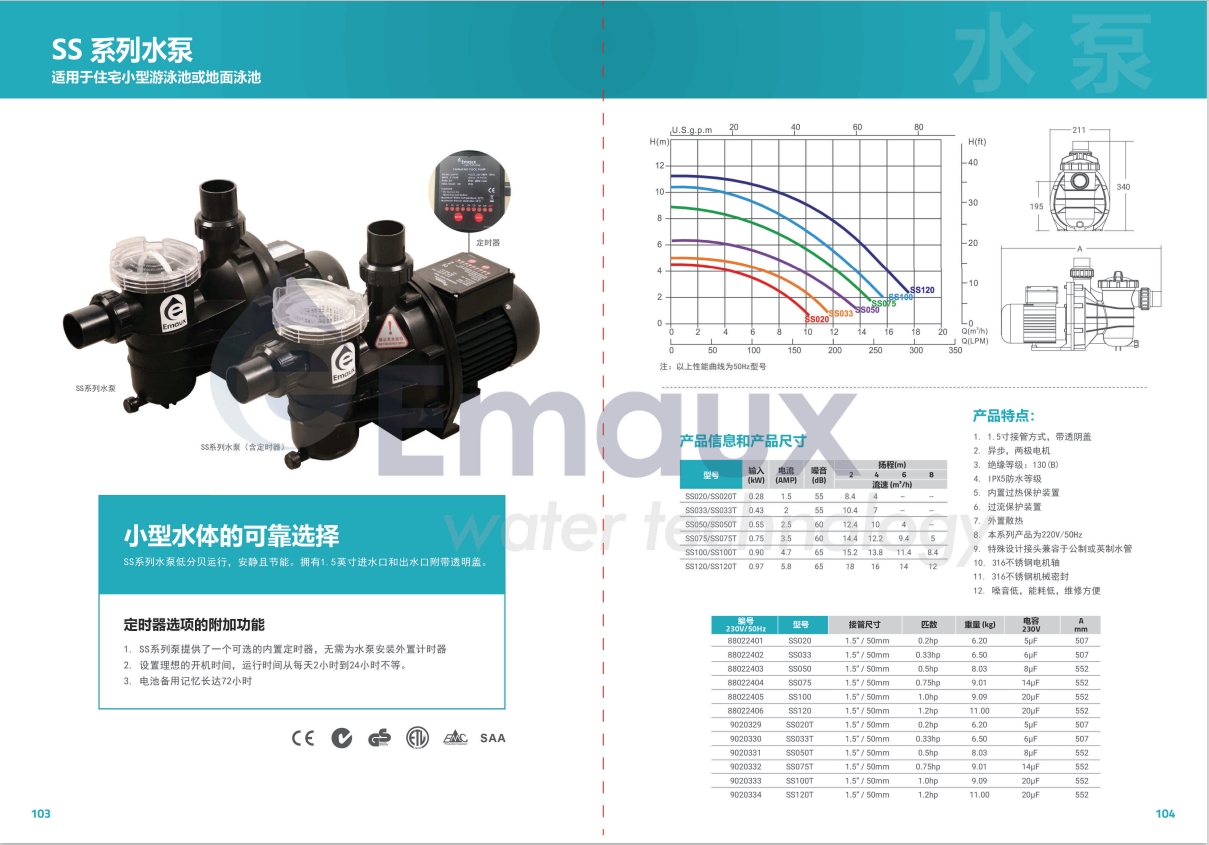 SS泵低分貝運行,安靜且節能。擁有1.5英寸進水口和出水口附帶透明蓋。