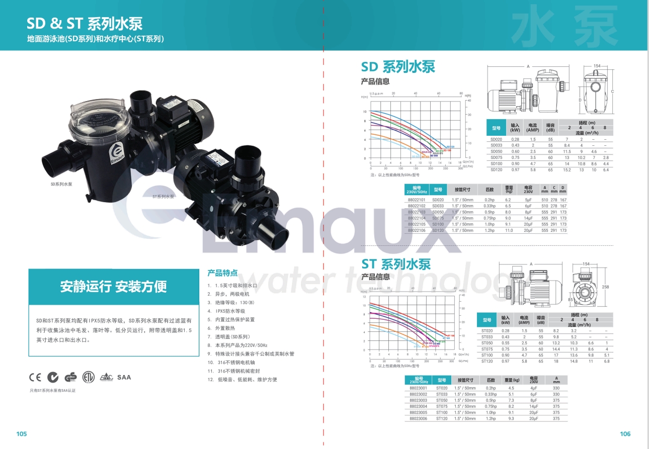 SD和ST系列泵均配有IPX5防水標(biāo)準(zhǔn),SD系列水泵配有過濾籃有利于收集泳池中毛發(fā)、落葉等。低分貝運(yùn)行,附帶透明蓋和1.5英寸進(jìn)水口和出水口。