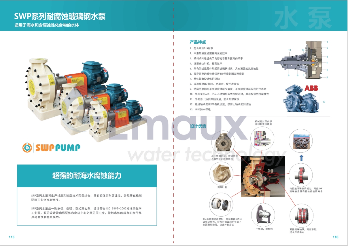 SWP系列水泵將生產材質和制造技術完美結合,具有極強的耐腐蝕性,并能夠在極端環境下安全可靠運行。 SWP系列水泵是一款單極,端吸、臥式離心泵,設計符合ISO 5199-2002標準的化學工業泵。泵的設計能確保泵體和電機中心之間的同心度,接觸水體的所有的部件都是耐腐蝕和非金屬的。