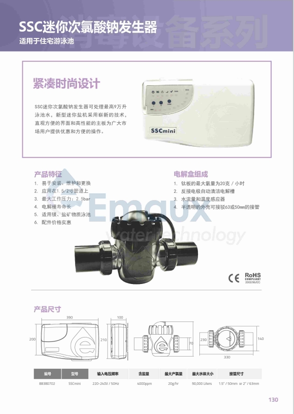 競(jìng)技池SSC迷你次氯酸鈉發(fā)生器可處理最高9萬(wàn)升泳池水,新型迷你鹽機(jī)采用嶄新的技術(shù),直觀方便的界面和高性能的主板為廣大市場(chǎng)用戶(hù)提供優(yōu)惠和方便的操作。