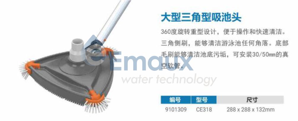 360度旋轉重型設計,便于操作和快速清潔。三角側刷,能夠清潔游泳池任何角落。底部毛刷能夠清潔池底污垢,可安裝30/50mm的真空軟管。