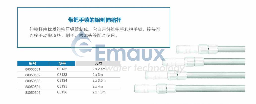伸縮桿由優(yōu)質(zhì)的抗壓鋁管制成,它自帶纖維把手和把手鎖。接頭可連接手動(dòng)撇渣器、刷子、吸池頭等配合使用。
