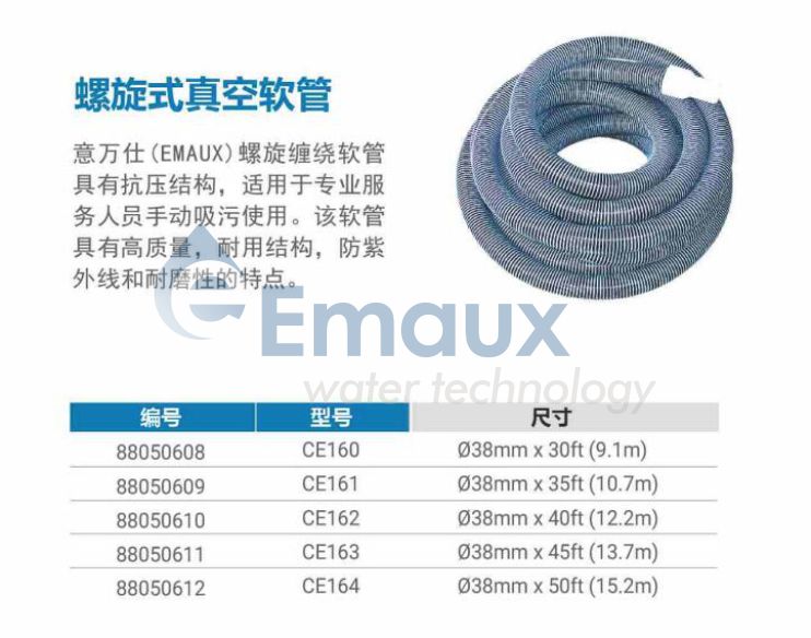 意萬仕(EMAUX)螺旋纏繞軟管具有抗壓結構,適用于專業服務人員手動吸污使用。該軟管具有高質量,耐用結構,防紫外線和耐磨性的特點。