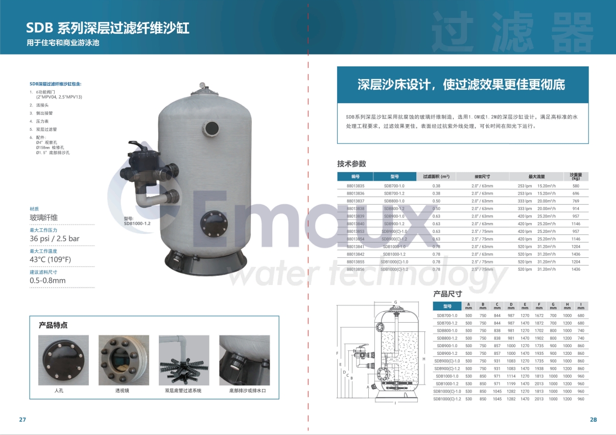 SDB系列深層沙缸采用抗腐蝕的玻璃纖維制造,選用1.0M或1.2M的深層沙缸設(shè)計(jì),滿足高標(biāo)準(zhǔn)的水處理工程要求,過(guò)濾效果更佳,表面經(jīng)過(guò)抗紫外線處理,可長(zhǎng)時(shí)間在陽(yáng)光下運(yùn)行。